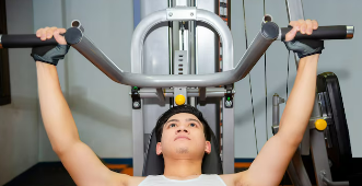 어깨 힘이 약해 빈 바도 부담스럽거나, 코어가 약해 머리 위에서 버티는 것이 불안하다면 프레스 머신을 활용하는 방법이 좋습니다. 머신 프레스는 궤도가 어느 정도 고정되어 있어 균형을 잡는 부담이 줄고, 어깨에 힘이 들어가는 감각을 더 쉽게 익힐 수 있습니다. 세팅은 손잡이가 어깨 높이에서 시작되도록 시트 높이를 맞추고, 등이 등받이에 밀착되도록 몸통을 고정하는 것부터 시작합니다. 이때 허리가 과하게 뜨지 않게 복부에 힘을 주고, 어깨가 으쓱 올라가지 않도록 목과 어깨의 긴장을 풀어주는 것이 중요합니다.